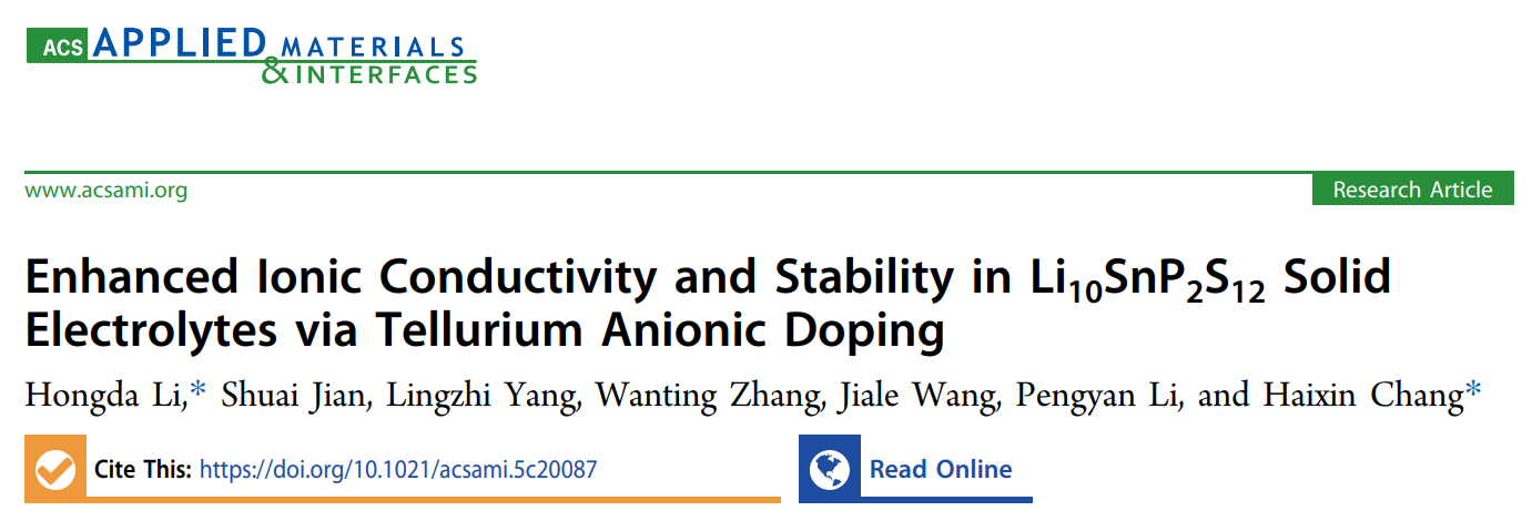 2025年11-12月,ACS Applied Materials & Interfaces(美国化学会《应用材料与界面》)和Journal of Materials Chemistry A(《材料化学A》)分别在线发表了该团队题为“Enhanced Ionic Conductivity and Stability in Li10SnP2S12 Solid Electrolytes via Tellurium Anionic Doping”(碲阴离子掺杂提高Li10SnP2S12固态电解质的离子导电率和稳定性)和“Heterovalent doping of amorphous oxyhalide solid electrolytes for high-performance all-solid-state lithium batteries”(异价掺杂无定形氧卤化物固体电解质用于高性能全固态锂电池)的研究论文。李宏达博士分别为论文第一/通讯作者和第一作者,湖北师范大学均为论文第一通讯单位;华中科技大学常海欣教授分别为论文的共同通讯作者和唯一通讯作者。ACS Applied Materials & Interfaces是中科院二区TOP期刊,最新影响因子为8.2;Journal of Materials Chemistry A是中科院二区TOP期刊,最新影响因子为9.5。