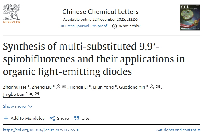 去年11月,Chinese Chemical Letters(《中国化学快报》)在线发表该团队题为“Synthesis of multi-substituted 9,9'-spirobifluorenes and their applications in organic light-emitting diodes”(多取代9,9'-螺二芴骨架的合成及其在有机发光二极管中的应用)的综述论文。我院2023级硕士研究生何展辉为论文第一作者,殷国栋教授、刘郑副教授和四川大学兰静波教授为通讯作者,湖北师范大学为第一通讯单位。Chinese Chemical Letters是1990年由中国化学会主办,中国医学科学院药物研究所承办的化学综合领域期刊,是中科院一区TOP期刊,最新影响因子为8.9。