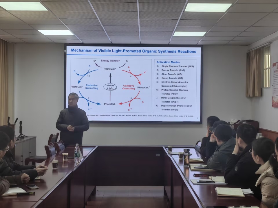 2月2日,应学院邀请,华中师范大学化学学院院长肖文精教授到访我院进行学术交流,为中青年教师和有机化学方向研究生作题为“有机光化学反应中的立体选择性调控”的学术报告。报告会由院长殷国栋教授主持。