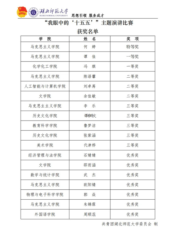 11月27日下午,湖北师范大学“我眼中的‘十五五’”主题演讲比赛决赛在信息大楼报告厅举行。党委统战部常务副部长熊荣伍,教学督导委员会副主任吴瑞霞,纪委、监察专员办公室综合室副主任柯静,学工处副处长熊英,发规处副处长颜永才受邀担任比赛评委。经过前期初赛,本次有18名选手晋级决赛,我院化学(优师)专业2401班冯琪同学凭借稳定发挥获一等奖,位列第3名。