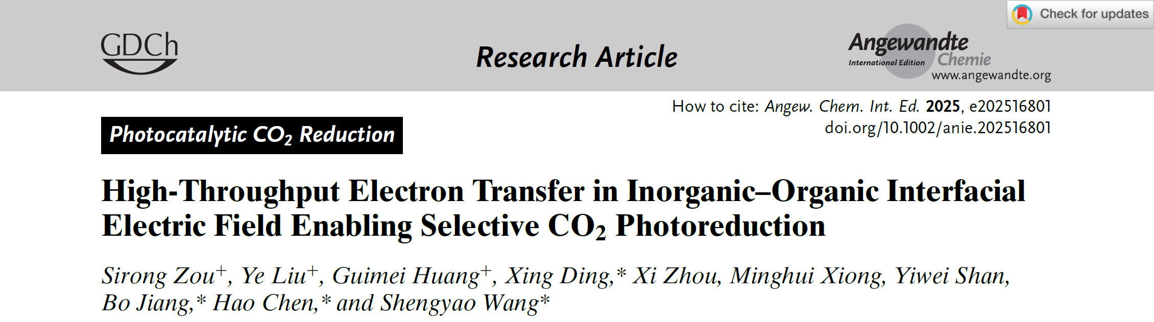 在CO₂光催化转化方面,以半导体CdS与钴联吡啶分子催化剂为模型体系,通过表面官能团调控成功构建了具有方向性的无机–有机界面电场。研究发现,相较于─NH₂修饰体系,─COOH官能化CdS能够与分子催化剂形成更强的非共价静电相互作用,从而显著增强界面电子通量。结合原位红外光谱、瞬态吸收光谱等多种先进表征手段,系统揭示了界面电场促进高能轨道快速填充、使CO₂优先参与质子–电子耦合反应并有效抑制析氢副反应的作用机制。在可见光驱动的CO₂还原反应中,构建的CdS-COOH/Co-bpy体系实现了高达2.52mmol·g⁻¹·h⁻¹的CO生成速率,CO₂还原选择性达到96.3%,为高选择性太阳能驱动碳转化提供了新的界面调控思路。该成果于10月发表于化学领域顶刊、中科院SCI大类一区、自然指数期刊Angew. Chem. Int. Ed.(IF:16.4),华中农业大学邹偲容为论文第一作者,刘野博士为共同第一作者,华中农业大学Xing Ding、Hao Chen、Shengyao Wang,上海师范大学Bo Jiang为论文共同通讯作者,湖北师范大学为论文第二单位。
