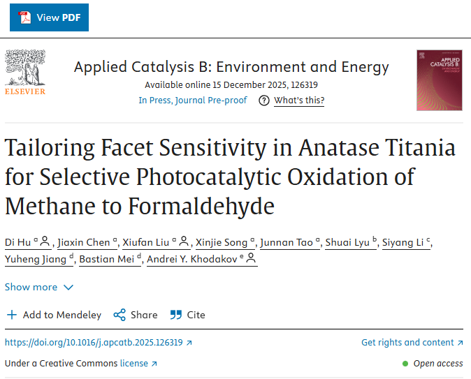 近日,Applied Catalysis B:Environment and Energy(《应用催化B:环境与能源》)在线发表物理化学教研室胡迪博士、刘修凡副教授与法国里尔大学Andrei Y. Khodakov教授等人合作的最新研究成果。论文题为“Tailoring Facet Sensitivity in Anatase Titania for Selective Photocatalytic Oxidation of Methane to Formaldehyde”(调控锐钛矿二氧化钛晶面敏感性实现光催化甲烷选择性氧化制甲醛)。胡迪博士为论文第一作者兼通讯作者,刘修凡副教授和Andrei Y. Khodakov教授为共同通讯作者,湖北师范大学为论文第一通讯单位。Applied Catalysis B:Environment and Energy是环境与能源催化领域国际顶级期刊、中科院一区Top期刊,最新影响因子为22.1。